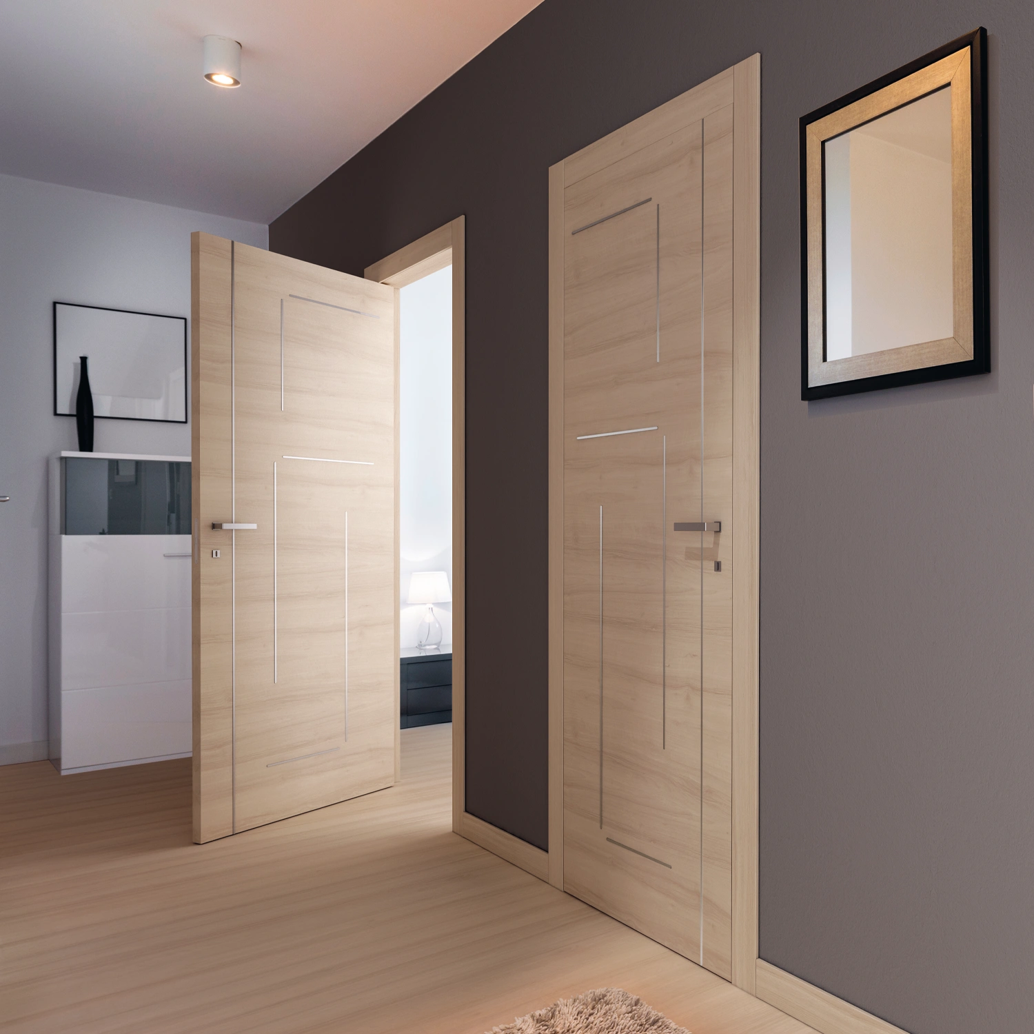 Questa caratteristica rende le porte interne va e vieni Alterno di AIP particolarmente adatte per contesti contemporanei che richiedono soluzioni dinamiche e flessibili.